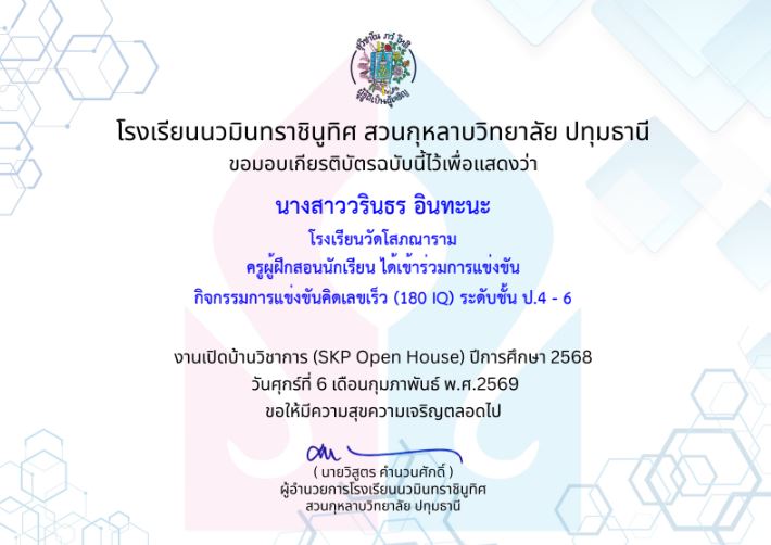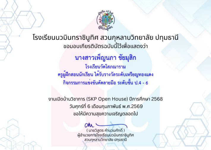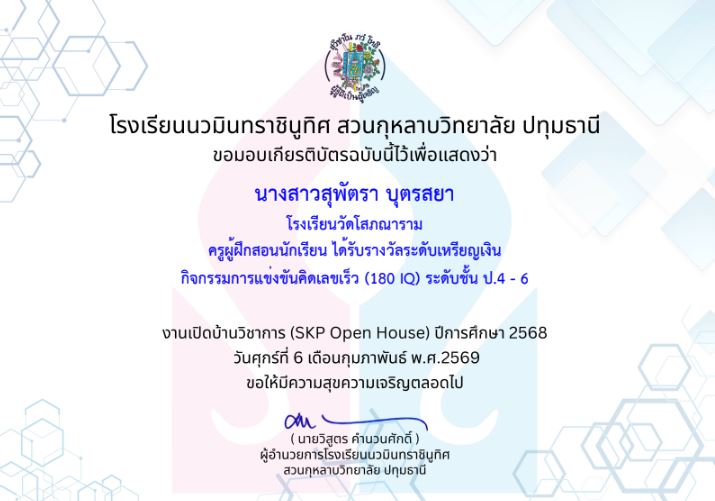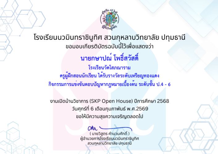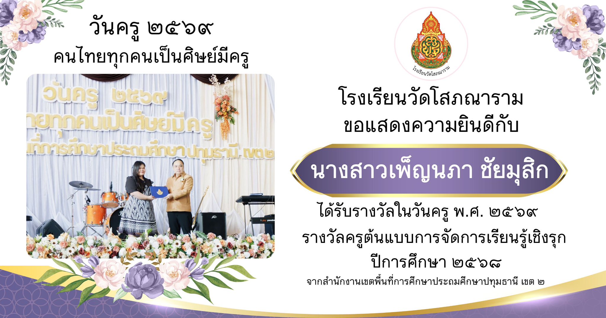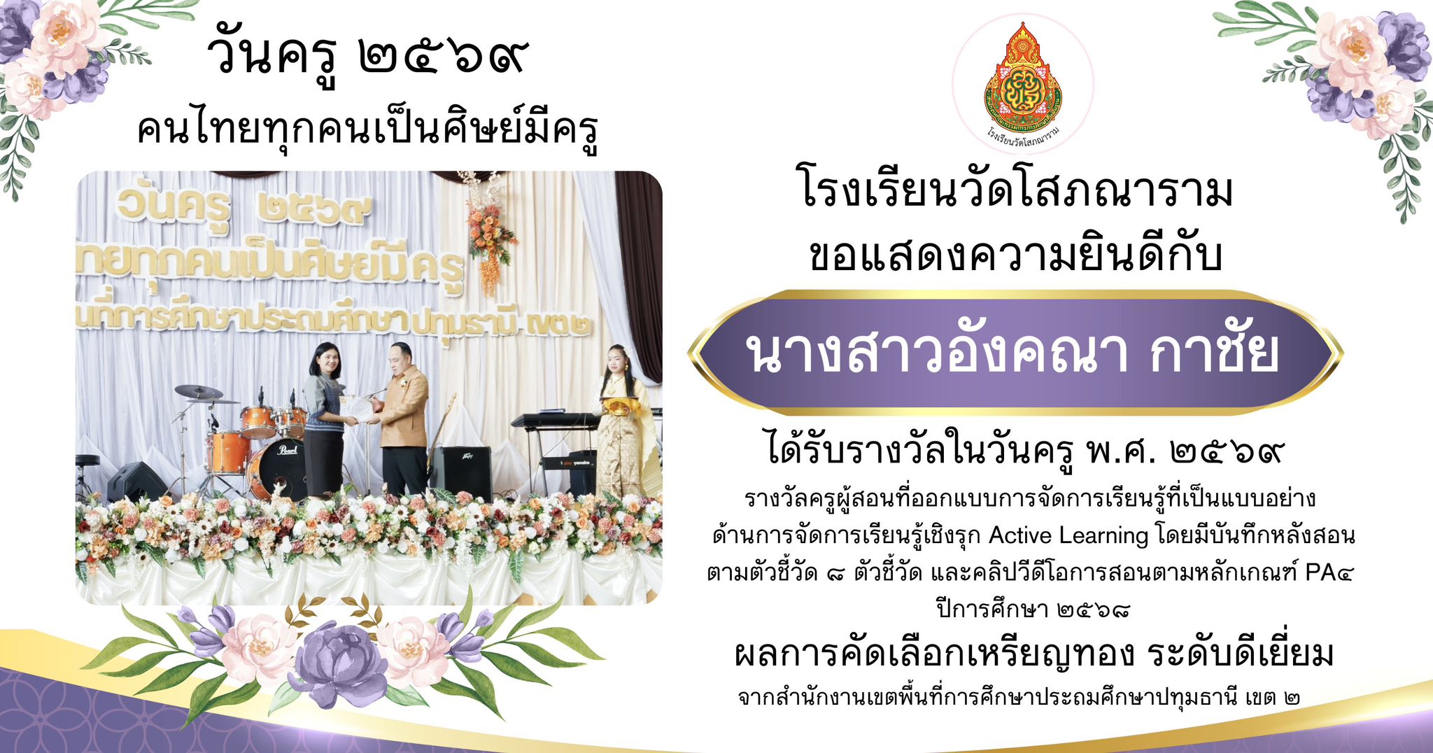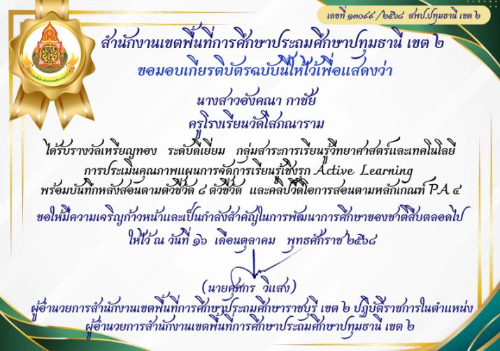 รางวัลครูผู้สอนที่ออกแบบการจัดการเรียนรู้ที่เป็นแบบอย่าง ด้านการจัดการเรียนรู้เชิงรุก Active Learning โดยมีบันทึกหลังสอน ตามตัวชี้วัด ๘ ตัวชี้วัด และคลิปวีดีโอการสอนตามหลักเกณฑ์ PA๔ ปีการศึกษา ๒๕๖๘ |